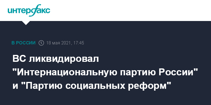 "Верховный суд полностью удовлетворил иски Министерства юстиции РФ о ликвидации политических партий "Интернациональная партия России" и "Партия социальных реформ" за неучастие в необходимом по закону количестве выборов в течение семи лет подряд", - сказал Шевченко "Интерфаксу" во вторник.
