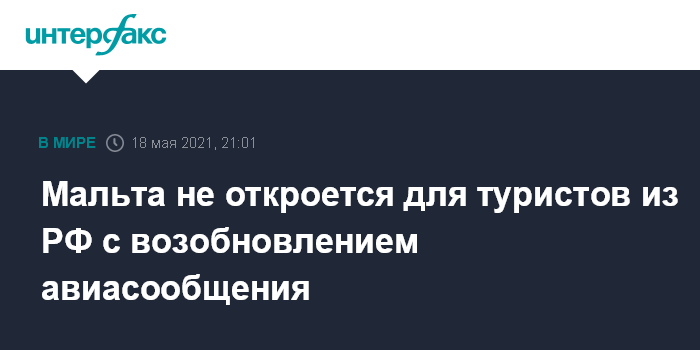 Москва. 18 мая. INTERFAX.RU - Мальта не будет принимать российских туристов после возобновления регулярного авиасообщения с РФ 25 мая, сообщила "Интерфаксу" пресс-секретарь Российского союза туриндустрии (РСТ) Ирина Тюрина.
