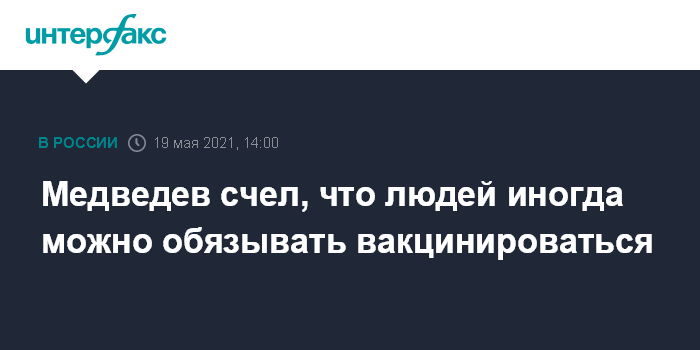Москва. 19 мая. INTERFAX.RU - Заместитель председателя Совета безопасности РФ Дмитрий Медведев допустил, что иногда в государственных интересах прививки следует сделать обязательными для защиты всего населения.