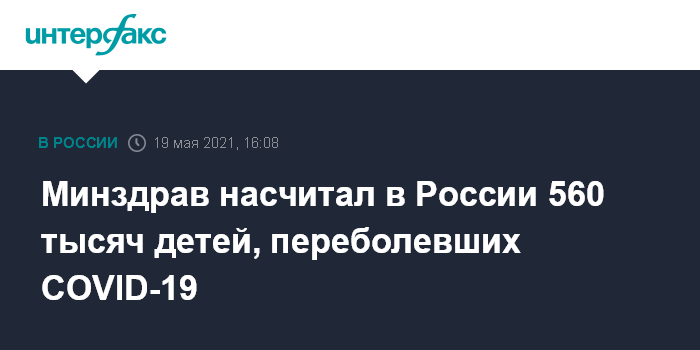 Москва. 19 мая. INTERFAX.RU - В России с начала пандемии коронавирусной инфекцией переболели около 560 тысяч детей в возрасте моложе 18 лет, 112 тысяч из них нуждаются в контроле за сатурацией, говорится в проекте приказа Минздрава, размещенном на портале проектов нормативных правовых актов.
