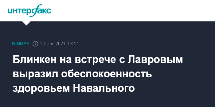 Москва. 20 мая. INTERFAX.RU - Госсекретарь США Энтони Блинкен в ходе встречи с главой МИД РФ Сергеем Лавровым сообщил, что США обеспокоены присутствием российских военных близ границ Украины и состоянием здоровья оппозиционного политика Алексея Навального.