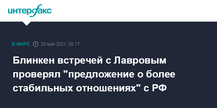Москва. 20 мая. INTERFAX.RU - Госсекретарь США Энтони Блинкен заявил, что встретился с главой МИД РФ Сергеем Лавровым, чтобы "проверить предложение о более стабильных и предсказуемых отношениях с Москвой".
