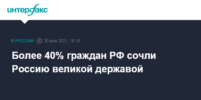 Москва. 20 мая. INTERFAX.RU - Россия, по мнению 42% граждан РФ, является одной из великих держав мира, свидетельствуют данные опроса ВЦИОМ, поступившие в четверг в "Интерфакс".