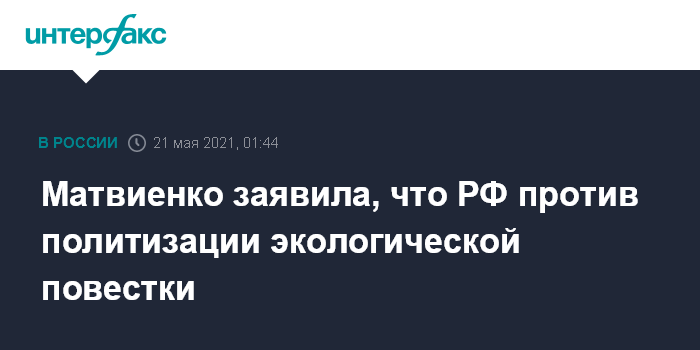 Москва. 21 мая. INTERFAX.RU - Некоторые государства используют экологическую повестку в политических и экономических целях, при этом Россия последовательно выступает против этого, заявила председатель Совета Федерации Валентина Матвиенко в интервью, опубликованном в пятницу в "Парламентской газете".