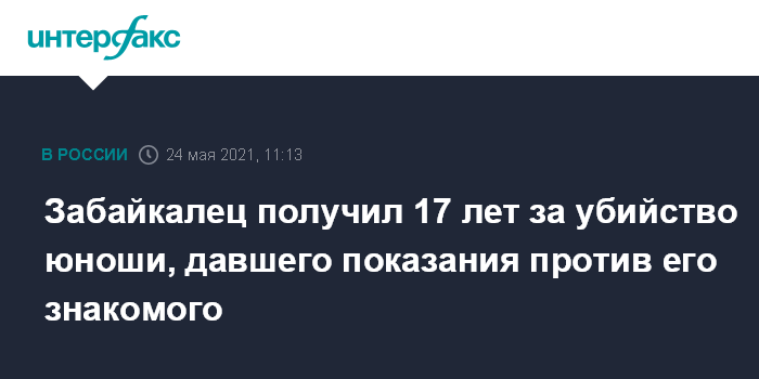 Москва. 24 мая. INTERFAX.RU - Суд в Забайкальском крае приговорил местного жителя к 17 годам колонии строгого режима за убийство несовершеннолетнего, который дал показания против его знакомого, сообщает региональное следственное управление СК РФ.