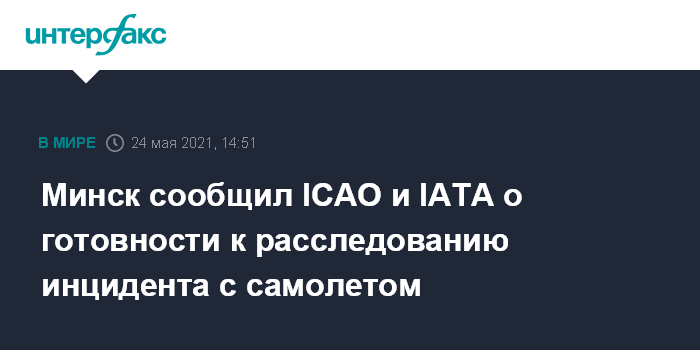 Москва. 24 мая. INTERFAX.RU - Белорусская сторона уведомила Международную организацию гражданской авиации (ICAO) и Международную ассоциацию воздушного транспорта (IATA) о готовности к сотрудничеству в расследовании инцидента с самолетом Ryanair рейса Афины - Вильнюс.