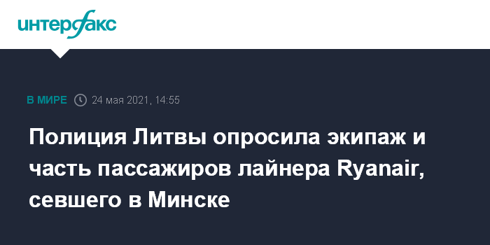 Москва. 24 мая. INTERFAX.RU - В досудебном расследовании дела о принудительной посадке в Минске пассажирского самолета авиакомпании Ryanair опрошено несколько десятков человек, сейчас в аэропорту Вильнюса проводится осмотр самолета.