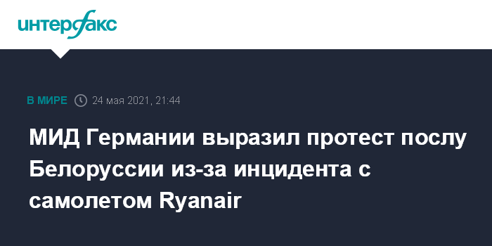 Москва. 24 мая. INTERFAX.RU - МИД Германии выразил протест послу Белоруссии Денису Сидоренко в связи с инцидентом с самолетом Ryanair, сообщил статс-секретарь министерства Мигель Бергер.