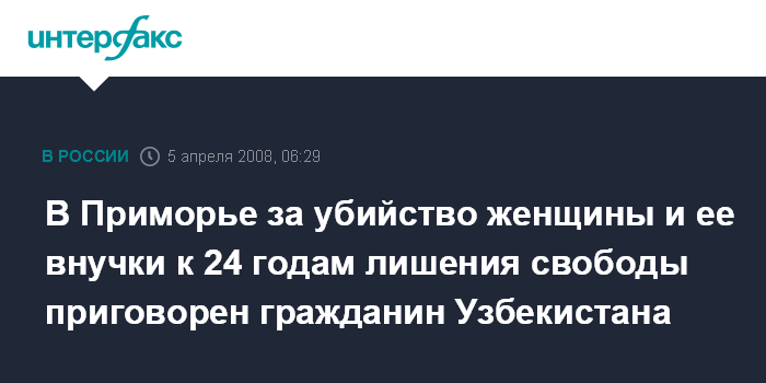 Владивосток. 5 апреля. ИНТЕРФАКС-ДАЛЬНИЙ ВОСТОК - Приморский краевой суд вынес приговор гражданину Узбекистана Собиржону Омонову, которого признал виновным в убийстве 74-летней жительницы Владивостока и ее десятимесячной внучки.