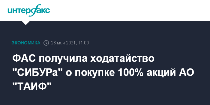 Москва. 26 мая. INTERFAX.RU - Федеральная антимонопольная служба получила ходатайство ПАО "СИБУР Холдинг" о приобретении 100% голосующих акций АО "ТАИФ", сообщила пресс-служба ведомства.