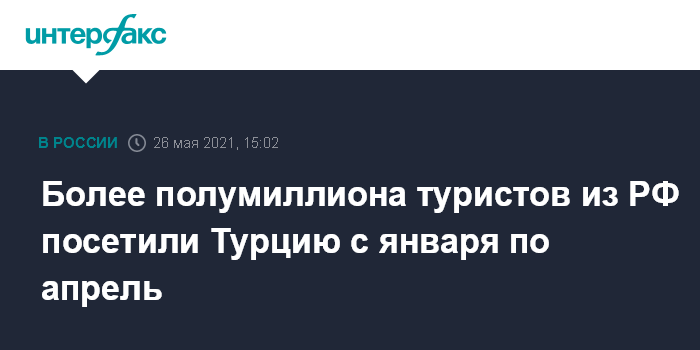 Москва. 26 мая. INTERFAX.RU - Турцию с января по апрель посетили 552 тыс. российских туристов, Россия снова заняла первое место среди иностранных рынков по этому показателю, следует из статистики министерства культуры и туризма страны.