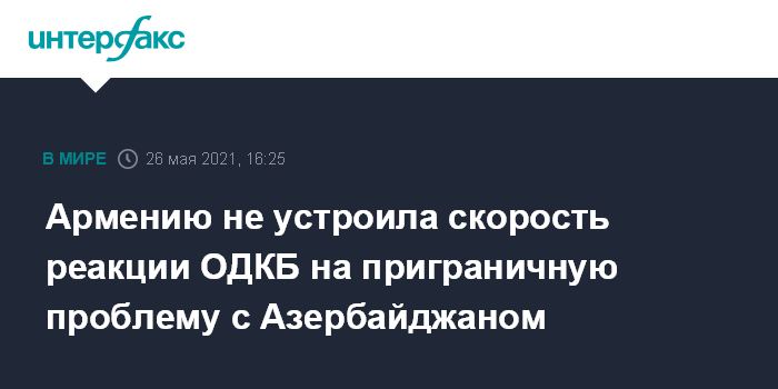 Москва. 26 мая. INTERFAX.RU - И.о. премьер-министра Армении Никол Пашинян заявил, что Ереван не удовлетворен скоростью действий ОДКБ по ситуации на границе с Азербайджаном. Он отметил, что Армения может обратиться в Совет безопасности ООН, если инструментарий ОДКБ (Организация Договора о коллективной безопасности) не поможет решению проблемы.