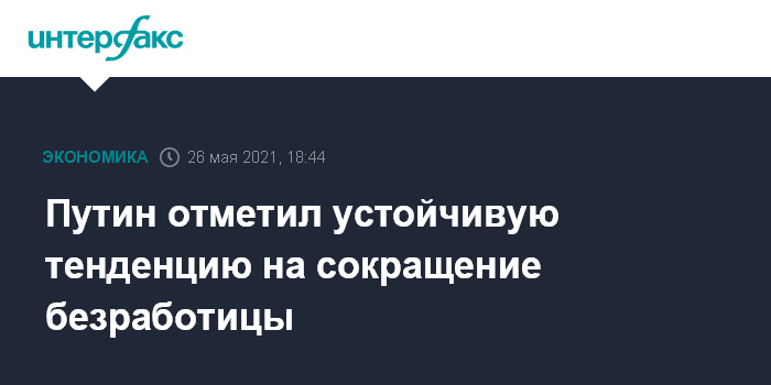 Москва. 26 мая. INTERFAX.RU - Безработица в России сокращается по сравнению с пиком периода эпидемии коронавируса, в апреле 2021 года ее уровень составил 5,2%, сообщил президент РФ Владимир Путин.