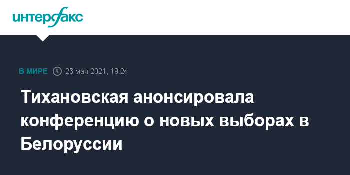 Москва. 26 мая. INTERFAX.RU - Лидер белорусской оппозиции и экс-кандидат в президенты Светлана Тихановская анонсировала международную конференцию о новых выборах в Белоруссии, которая состоится 1-2 июня.