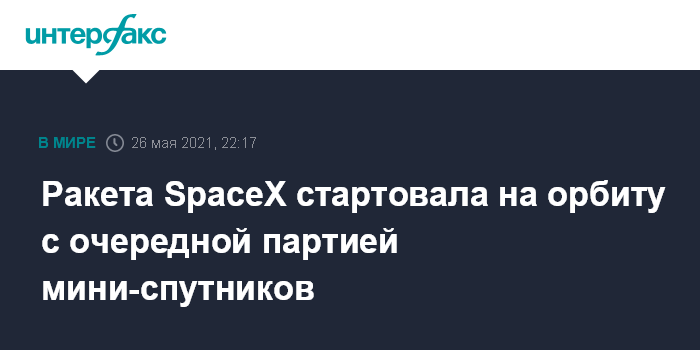 Москва. 26 мая. INTERFAX.RU - Тяжелая ракета-носитель Falcon 9 в среду стартовала на орбиту с очередной партией из 60 мини-спутников для пополнения орбитальной группировки глобальной сети интернет-покрытия системы Starlink, сообщила компания-разработчик SpaceX.