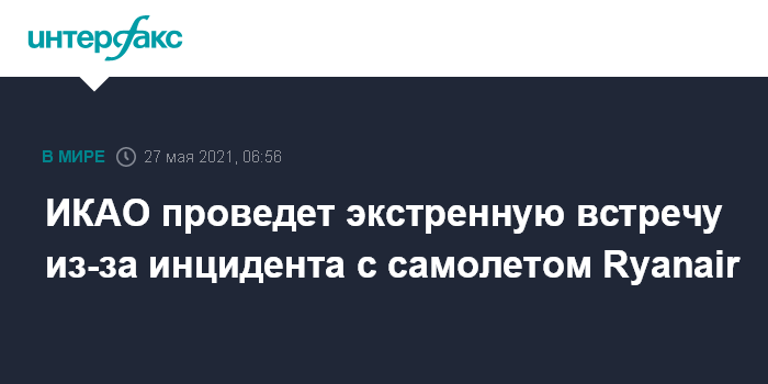 Москва. 27 мая. INTERFAX.RU - Международная организация гражданской авиации (ИКАО), входящая в ООН, как ожидается, в четверг проведет экстренную встречу в связи с инцидентом с посадкой самолета авиакомпании Ryanair в Белоруссии.