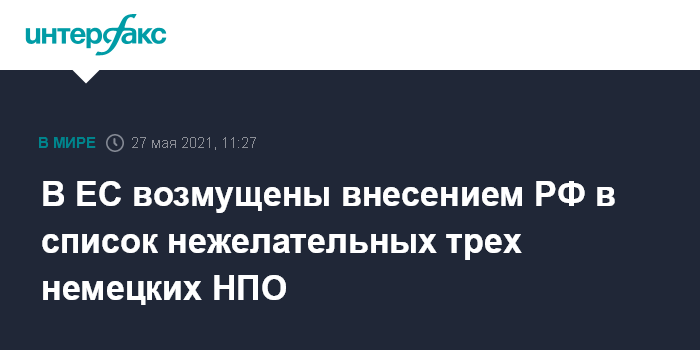 Москва. 27 мая. INTERFAX.RU - Официальный представитель Европейской внешнеполитической службы (ЕВС) заявил, что Европейский союз отвергает принятое 26 мая генеральным прокурором России решение о включении трех немецких неправительственных организаций (НПО) в список "нежелательных организаций".