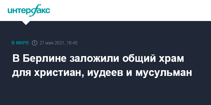 Москва. 27 мая. INTERFAX.RU - В Берлине в четверг заложили церковь House of One, которая будет служить местом религиозных встреч для представителей сразу трех религий - христианства, иудаизма и ислама, сообщает телерадиокомпания Rbb.