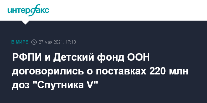 "РФПИ и Детский фонд ООН (United Nations International Children's Emergency Fund, UNICEF) объявляют о подписании соглашения для поставок 220 миллионов доз двухкомпонентной российской вакцины против коронавируса "Спутник V" для вакцинации 110 млн человек", - говорится в сообщении РФПИ в четверг.