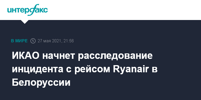 Москва. 27 мая. INTERFAX.RU - Министр транспорта Ирландии Имон Райан в четверг сообщил о решении Международной организации гражданской авиации (ИКАО) начать расследование в связи с инцидентом 23 мая в Белоруссии с самолетом авиакомпании Ryanair.