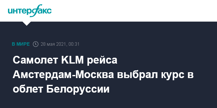 Москва. 28 мая. INTERFAX.RU - Самолет нидерландской авиакомпании KLM, выполняющий вывозной рейс, минуя территорию Белоруссии, вылетел из Амстердама в Москву.