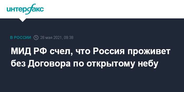 Накануне, 27 мая, в МИД России "Интерфаксу" сообщили, что Вашингтон уведомил Москву о решении не возвращаться в Договор по открытому небу.