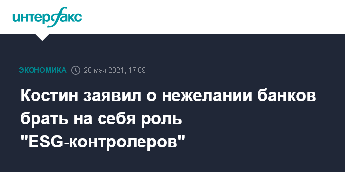 Москва. 28 мая. INTERFAX.RU - Банки не хотят брать на себя роль "ESG-контролеров", опасаясь, что все расходы на организацию системы отслеживания деятельности заемщиков лягут на них - как уже было с противодействием отмыванию доходов и финансированию терроризма (ПОД-ФТ), заявил глава ВТБ Андрей Костин.