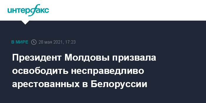 Москва. 28 мая. INTERFAX.RU - Президент Молдовы Майя Санду выразила озабоченность судьбой людей, "несправедливо арестованных в Беларуси".