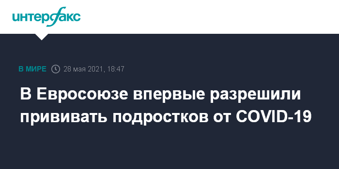 Москва. 28 мая. INTERFAX.RU - Европейское агентство по лекарственным средствам (ЕМА) сообщило, что одобрило применение вакцины Comirnaty, разработанной компаниями Pfizer и BioNTech, для подростков возрастом от 12 до 15 лет.