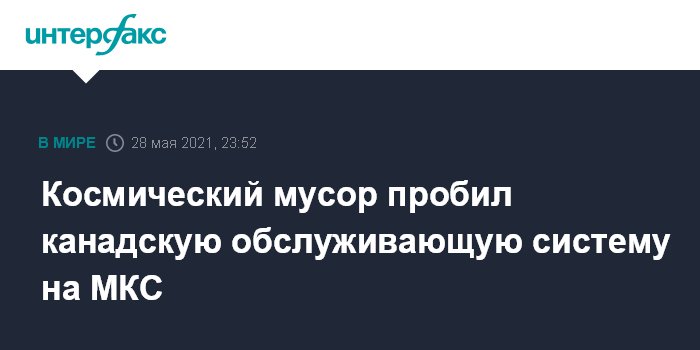 Москва. 28 мая. INTERFAX.RU - Космический мусор оставил небольшую пробоину на канадской передвижной обслуживающей системе Canadarm-2 на Международной космической станции (МКС), сообщается на сайте Канадского космического агентства (CSA).