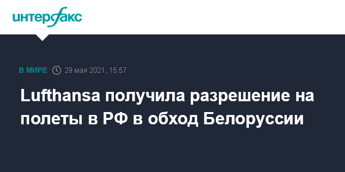 Москва. 29 мая. INTERFAX.RU - Немецкая авиакомпания Lufthansa имеет разрешение на полеты в РФ в обход воздушного пространства Белоруссии, сообщила "Интерфаксу" в субботу представитель пресс-службы авиакомпании.