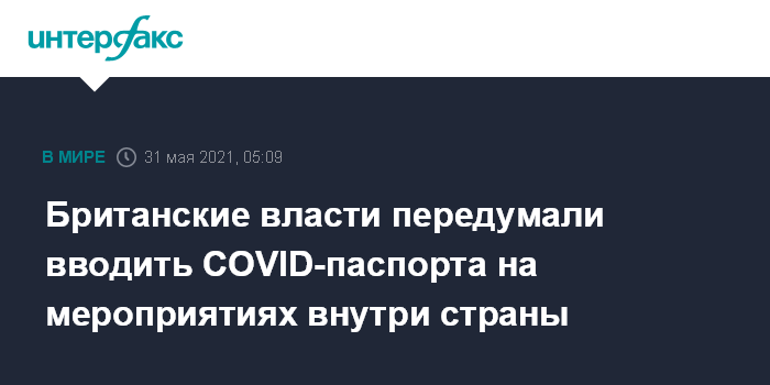 Великобритания с февраля изучала вопрос о возможности введения внутри страны сертификатов, которые могли бы подтвердить COVID-статус гражданина. Предполагалось, что они станут обязательными на таких мероприятиях, как футбольные матчи, концерты, фестивали и деловые конференции. Доказательством отсутствия коронавируса было решено считать сделанную прививку, свежий отрицательный тест или антитела после перенесенного COVID-19.