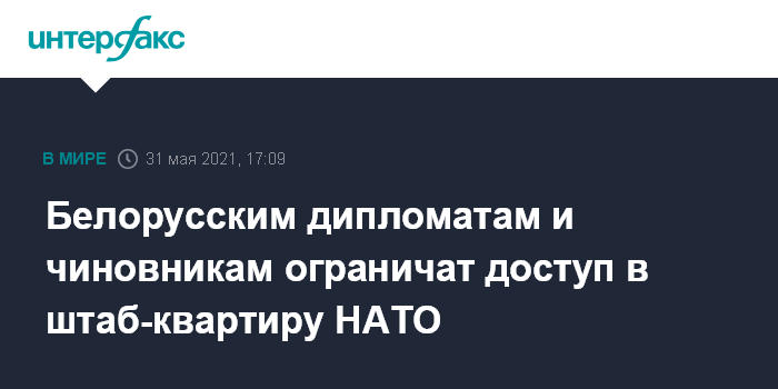Москва. 31 мая. INTERFAX.RU - Руководство НАТО решило ограничить доступ в штаб-квартиру альянса для белорусских должностных лиц из соображений безопасности, объявил генсек НАТО Йенс Столтенберг.