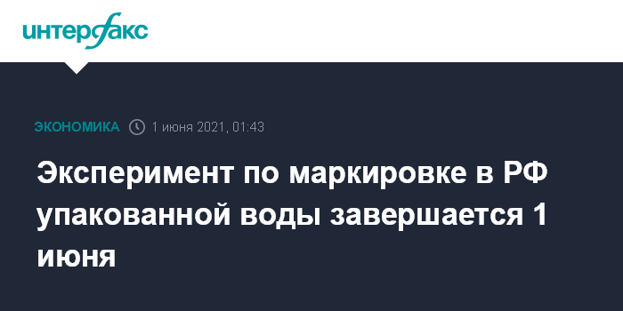 Москва. 1 июня. INTERFAX.RU - Эксперимент по маркировке в России упакованной воды завершается 1 июня. С 1 сентября 2021 года производители бутилированной воды должны будут регистрироваться в системе мониторинга за оборотом товаров, подлежащих обязательной маркировке.