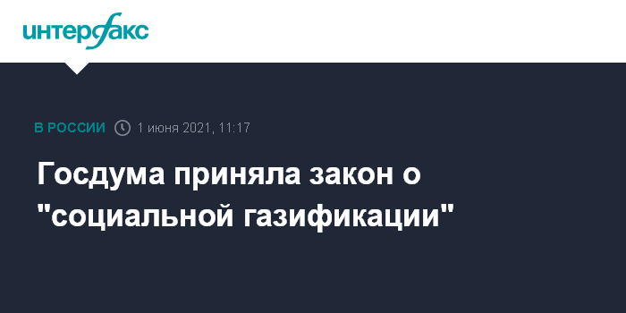 Москва. 1 июня. INTERFAX.RU - Депутаты Госдумы приняли в третьем чтении поправки к закону о газоснабжении, которые позволят выполнить поручение президента о бесплатной для жильцов подводке газа к отдельным домам в уже газифицированных населенных пунктах.