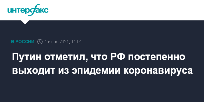 Москва. 1 июня. INTERFAX.RU - Россия постепенно выходит из эпидемии коронавируса, но опасности и тревоги по этому поводу еще сохраняются, заявил президент РФ Владимир Путин.