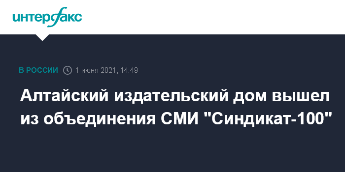 Москва. 1 июня. INTERFAX.RU - Барнаульский издательский дом "Алтапресс" вышел из созданного по инициативе "Новой газеты" объединения СМИ "Синдикат-100", в который вступил в марте 2020 года. Гендиректор ИД Юрий Пургин объяснил это "несовпадением повестки".
