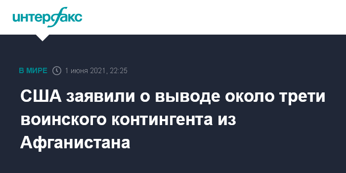 Москва. 1 июня. INTERFAX.RU - Вывод американского контингента из Афганистана реализован приблизительно на треть, сообщило во вторник Центральное командование ВС США.