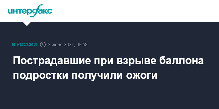 Москва. 2 июня. INTERFAX.RU - В МЧС Вологодской области сообщили, что пять подростков, которых госпитализировали из поселка "Урожайный", получили ожоги. Ранее источник "Интерфакса" сказал, что они во вторник попытались разобрать газовый баллон, он был под давлением и взорвался.