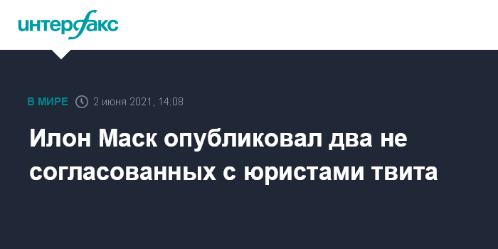 Москва. 2 июня. INTERFAX.RU - Гендиректор Tesla Илон Маск дважды нарушил условия соглашения с Комиссией по ценным бумагам и биржам (SEC) США, по которым он обязан согласовывать с юристами компании твиты с определенными данными о Tesla, пишет The Wall Street Journal.