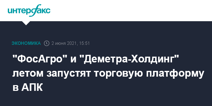 Москва. 2 июня. INTERFAX.RU - "ФосАгро", один из ведущих мировых производителей фосфорсодержащих удобрений, и вертикально интегрированный зерновой "Деметра-Холдинг" (контролируется ВТБ) планируют летом 2021 года запустить электронную торговую платформу в АПК.