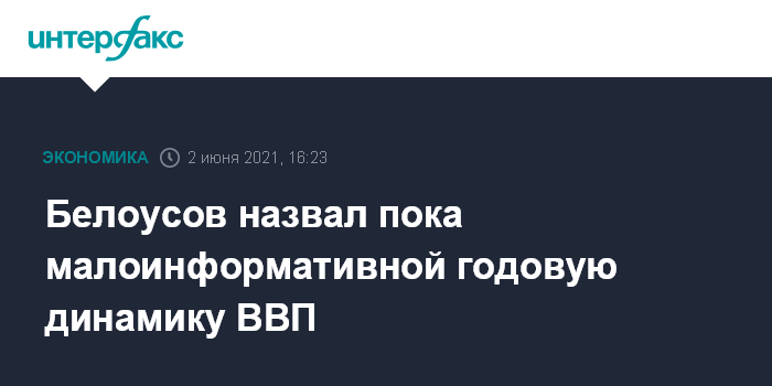 Москва. 2 июня. INTERFAX.RU - Годовая динамика ВВП России во II квартале малоинформативна из-за низкой базы прошлого года, определенность в динамике наступит ближе к сентябрю, заявил журналистам в кулуарах ПМЭФ первый вице-премьер Андрей Белоусов.