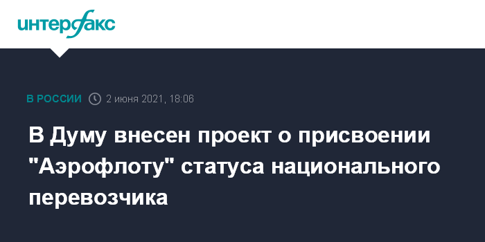 Москва. 2 июня. INTERFAX.RU - В Госдуму внесли законопроект, который присваивает "Аэрофлоту" статус национального перевозчика. Это позволит ему получать по решению правительства ряд финансовых преференций, а также не будет распространять на него действие закона о банкротстве.