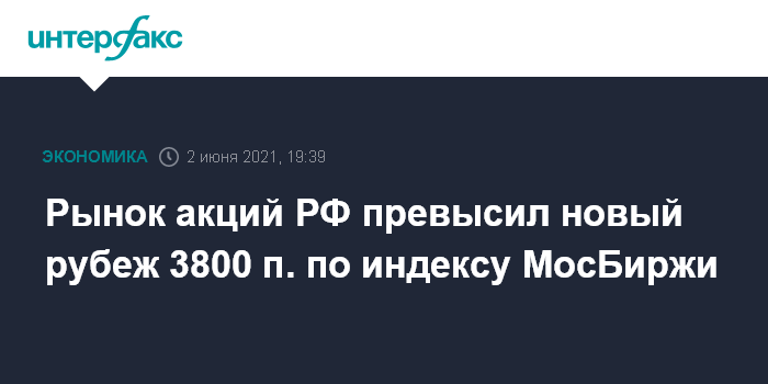 Москва. 2 июня. INTERFAX.RU - Рынок акций РФ в среду продолжил подъем вслед за мировыми фондовыми площадками и нефтью (Brent превысила $71 за баррель) на фоне ожиданий увеличения спроса по мере восстановления мировой экономики, индекс МосБиржи впервые преодолел рубеж 3800 пунктов.