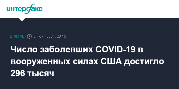 Москва. 2 июня. INTERFAX.RU - Количество заболевших коронавирусом в Вооруженных силах США с начала пандемии составило почти 296 тыс., увеличившись за последние два месяца на 9,8%, следует из данных Пентагона.
