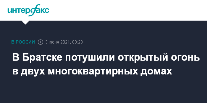 Москва. 3 июня. INTERFAX.RU - Пожарные ликвидировали открытое горение в двух двухэтажных многоквартирных деревянных домах в поселке Заярский города Братска (Иркутская область), сообщили "Интерфаксу" в четверг в пресс-службе главного управления МЧС по региону.