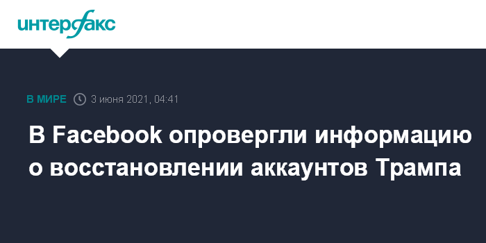 Москва. 3 июня. INTERFAX.RU - Представитель компании Facebook Энди Стоун опроверг появившиеся ранее сообщения о том, что аккаунты бывшего президента США Дональда Трампа в Facebook и Instagram были восстановлены.