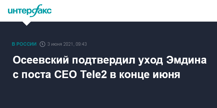 Москва. 3 июня. INTERFAX.RU - Гендиректор Tele2 Сергей Эмдин может покинуть свой пост уже в конце июня, сообщил журналистам в кулуарах ПМЭФ-2021 президент ПАО "Ростелеком" Михаил Осеевский.