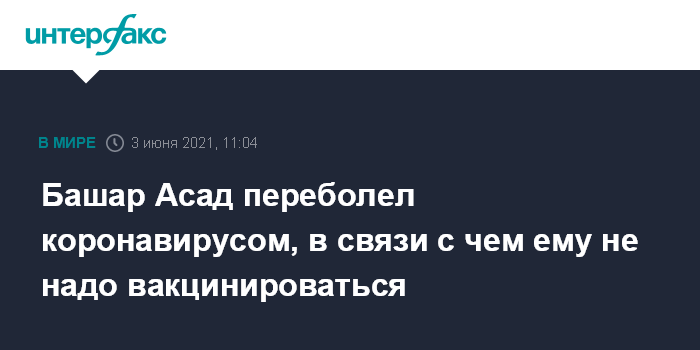 "Президент Асад болел коронавирусом, у него высокие антитела. В связи с этим у него нет необходимости в том, чтобы вакцинироваться", - сказал Хаддад в четверг журналистам, отвечая на вопрос "Интерфакса".