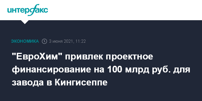Москва. 3 июня. INTERFAX.RU - "ЕвроХим" привлек проектное финансирование на сумму около 100 млрд рублей для строительства второй очереди завода по производству аммиака и карбамида в Кингисеппе (Ленинградская область).